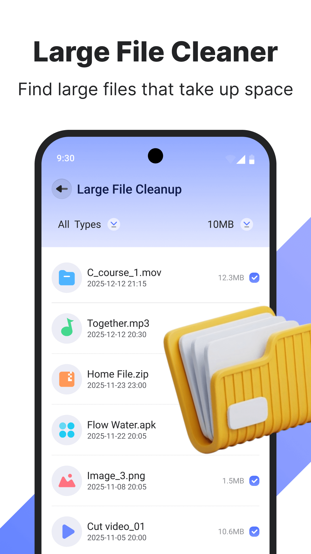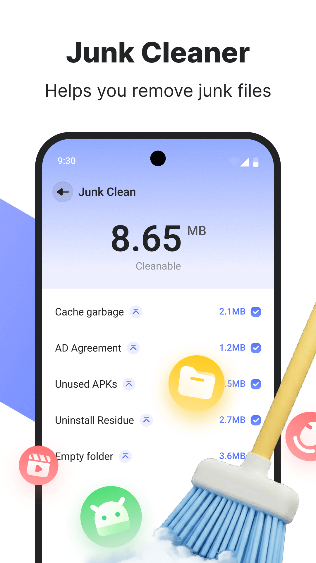 File Identification: Identify system cache, residual files, obsolete APKs, and temporary junk files.