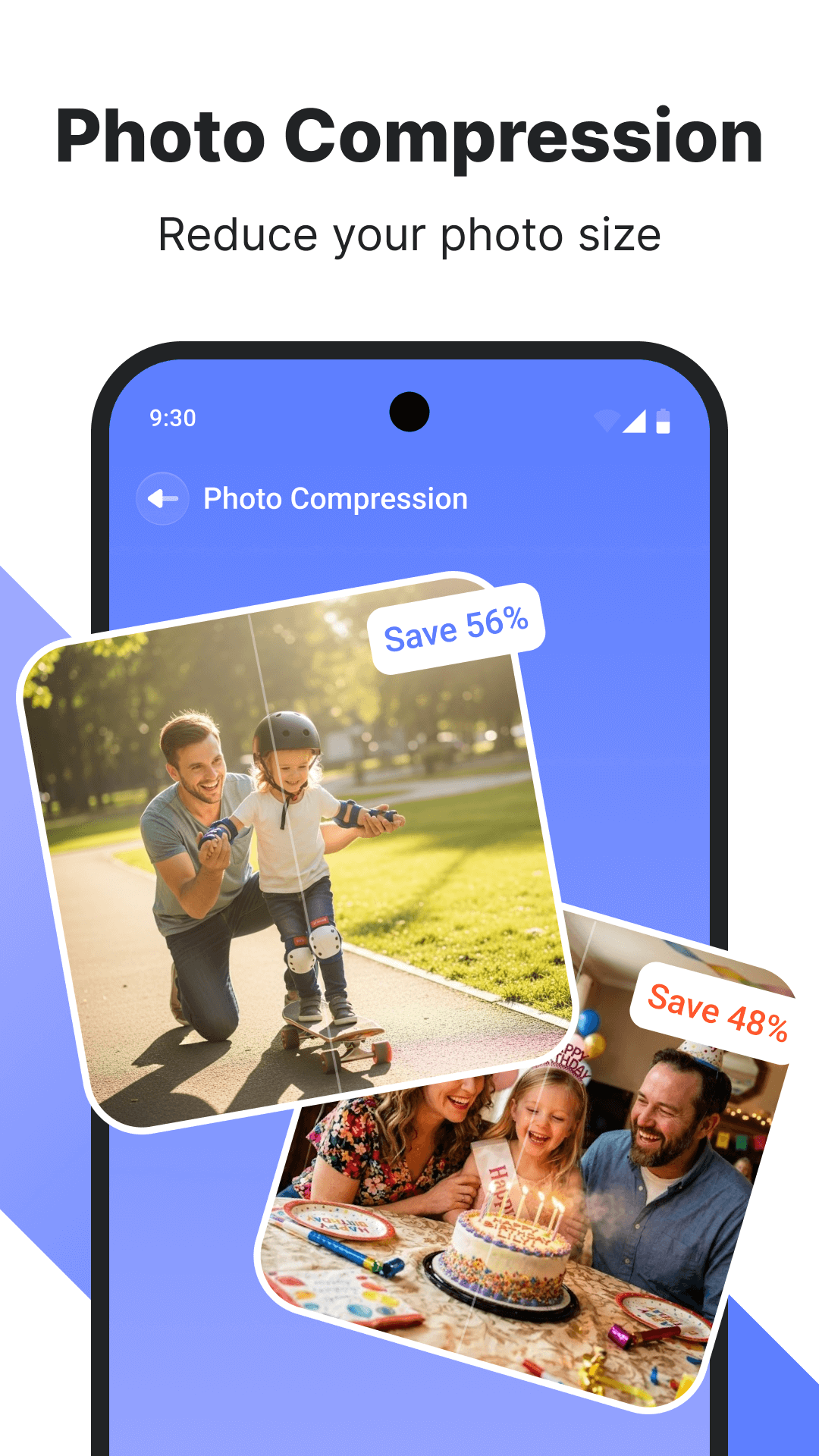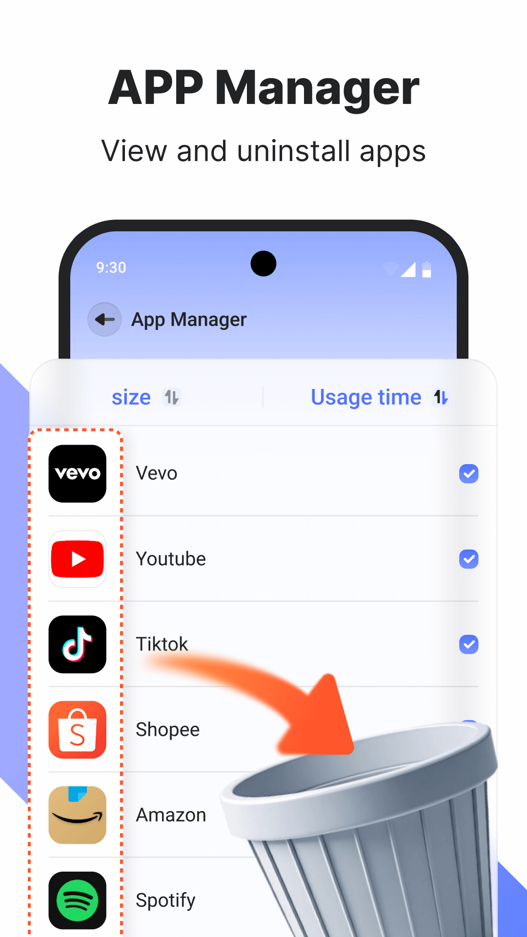 Remove selected items, compress media when needed, and keep apps organized with the manager.